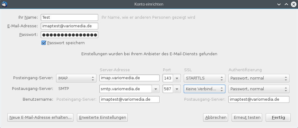 Alternativ können Sie unter Port 587 und unter SSL StartTLS wählen und dann “Erneut testen” klicken. Meistens schlägt der Verbindungstest dann jedoch erneut fehl, und Thunderbird meldet einen Fehler. In diesem Fall sollten sie so lange auf “Erneut testen” klicken, bis es irgendwann klappt. Dies erfordert normalerweise mehrere Versuche, doch irgendwann funktioniert es und Sie können “Fertig” auswählen.