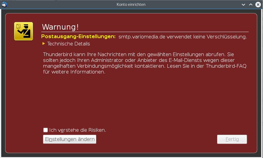 In aktuellen Thunderbird-Versionen wird dann im nächsten Schritt eine Warnung angezeigt, dass keine Verschlüsselung genutzt wird, obwohl unsere Server sehr wohl Verschlüsselung unterstützen: