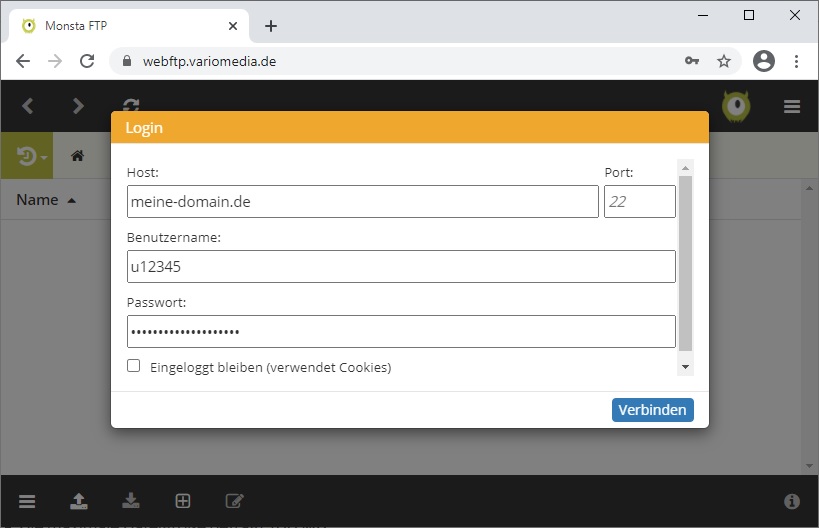 Die Verbindung zum Webserver erfolgt verschlüsselt mittels SFTP. Auch die Datenübertragung zwischen Browser und WebFTP-Server erfolgt verschlüsselt (https://…). Wir nutzen als Software das beliebte WebFTP-Programm MonstaFTP.
