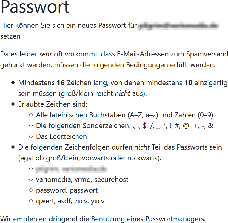Ab sofort ist es auch in den E-Mail-Einstellungen (my.variomedia.de/mail), eigene Passwörter zu wählen. Es gelten dabei strenge Richtlinien, die zu einfache Passwörter verhindern sollen. Ein gutes Passwort ist eher länger als kürzer und wird ausschließlich für einen einzigen Dienst verwendet. Wir empfehlen dringend die Nutzung eines Passwortmanagers.